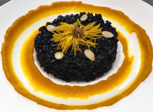 Unisci al riso il succo del limone e servi con la crema di zucca e le mandorle tostate.